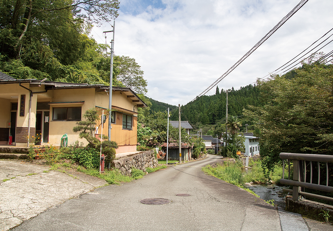 豊岡市街地を抜けて国道178号のバイパスから側道に入り、森本の交差点で竹野海岸とは反対の方向へと進んでいく豊岡市竹野町椒地区。三椒川に沿った県道を進むと、シンボル「おまき桜」が見え、おまき桜を過ぎると、目的地まではあと少しです。のどかな山間の道沿いに床瀬の集落が見えてきます。
