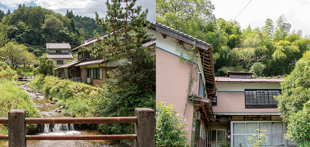 (画像:<左>橋の上から三椒川を望む景色<右>養蚕農家の特徴である越屋根)