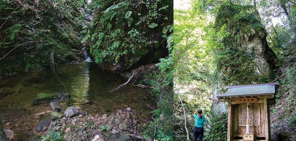 尊仏さんとは集落から少し離れた山中にある「狗留尊仏」のことです。参道入口から約20分歩くと、参道の傾斜が急になってきた頃に見えてくる狗留尊仏に神々しさを感じます。高さ約20メートル、幅5メートルの円錐状の巨岩で、縁結びの神、安産の神として崇敬されています。今からおよそ二千万年前にできたとされる流紋岩は、下の清流を産湯に使ったり、この岩の小片をお守りにすると子どもができるなど女性の参詣が多く、現在でも子を授かったとお礼参りに訪れる人が後を絶ちません。