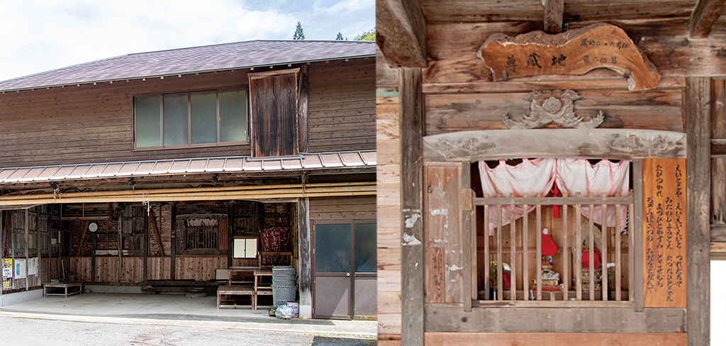 旧道から少し開けた場所にはお堂があり、夏は盆踊りなどを行います。以前は床が敷かれていて、お茶を飲んだりする休憩所としても利用されていました。お堂の中にはお地蔵様が佇んでおり、但馬六十六地蔵尊霊場の十六番札所となっています。