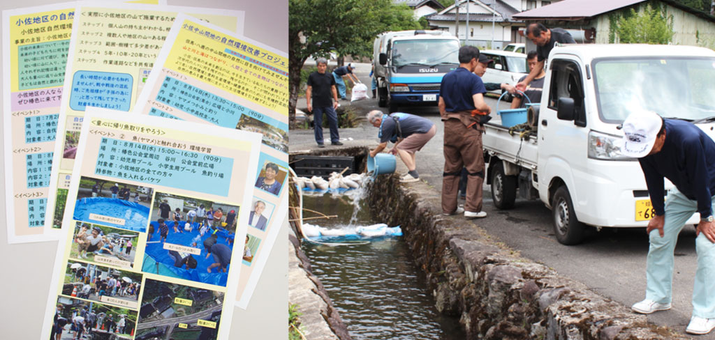 「中山間地域である小佐地区には小佐川(おさがわ)と日畑川(ひばたがわ)という二つの川がありますが、川を美しくするにはまず山の手入れが大切なのだと私自身学びました。川の水が豊かになれば、その豊かさはヤマメやイワナ、ホタル、カワヤナギなどの水生動植物に循環されます。自然環境のバランスを整えるため、地域内の至る所にヒオウギやフジバカマ、黄レンゲツツジ等の植栽も行なっています」。