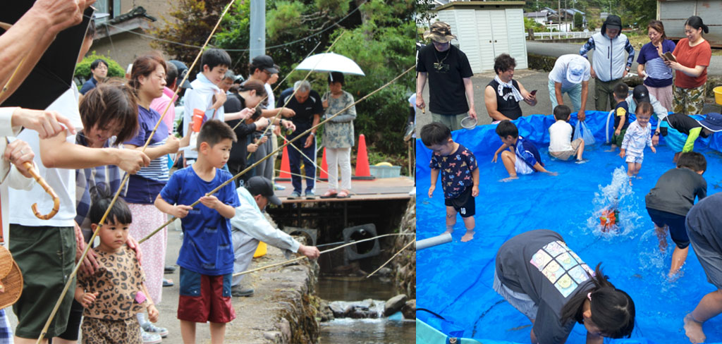 「久しぶりに子ども達の声が響いて賑やかになりました」と、西田さんは満足そうに振り返ります。小さな子どもにはつかみどりプール、中高生や大人は川を堰き止めた釣り堀で釣り体験をさせるなど、幅広い年齢が参加できるよう工夫も満載。椿色区初開催となった2023年は地区内のみで行いましたが、3年目には但馬内外から多くの参加者が集まり、およそ250名ほどの人々が川魚との触れ合いを楽しみました。
