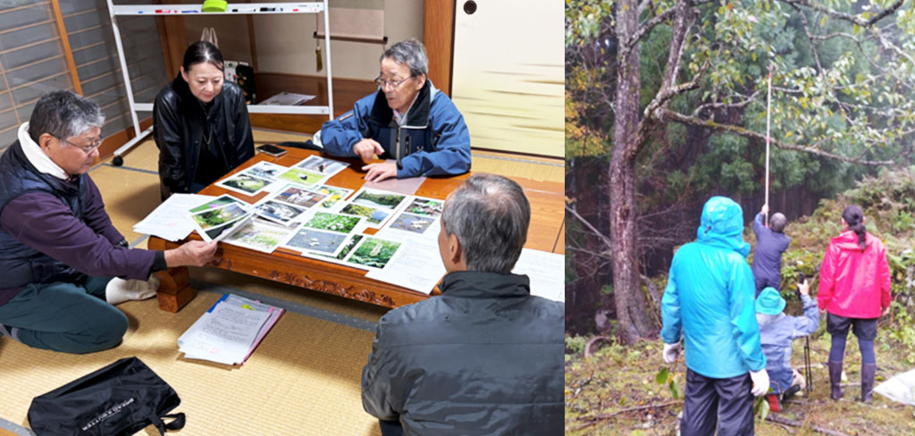 (画像:<左>自然学習「妙見の自然環境と植物学集」の様子<右>野外での同学習)