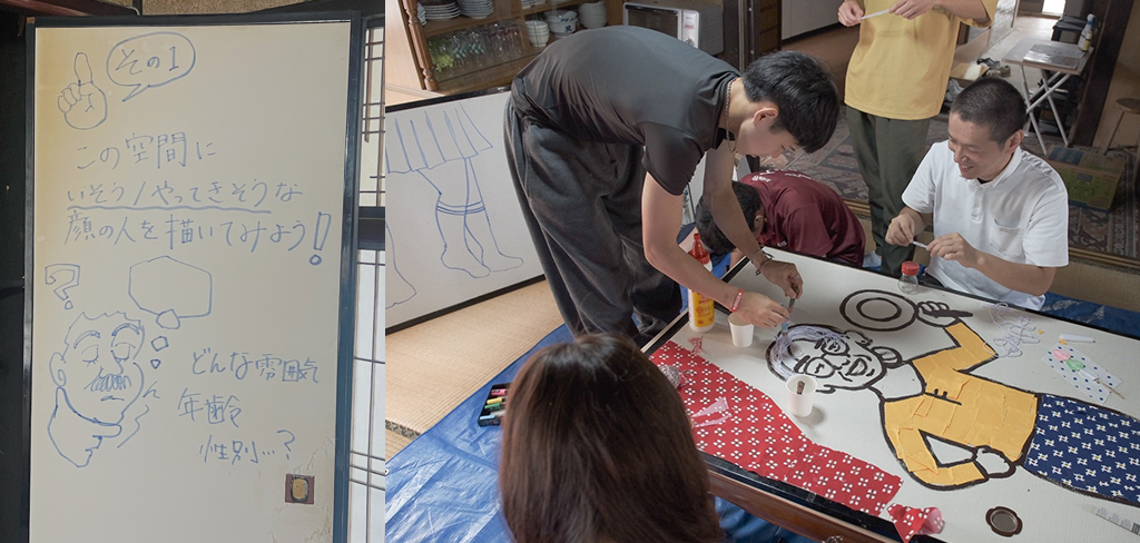 「『絵は苦手だから貼る作業をやるね』といった声が聞こえてきたのが印象的でした。グループ内で役割を見つけたり、任せたり、どんなアイデアが出ても受け入れていたり、温かい時間でした。本当に開催してよかったです。描かれたキャラクターには驚くような設定があるので、ぜひYORUに足を運ばれた際には見て欲しいです」と振り返る田中さん。YORUの室内には、3枚の襖と参加者のデザイン案が今も飾られています。