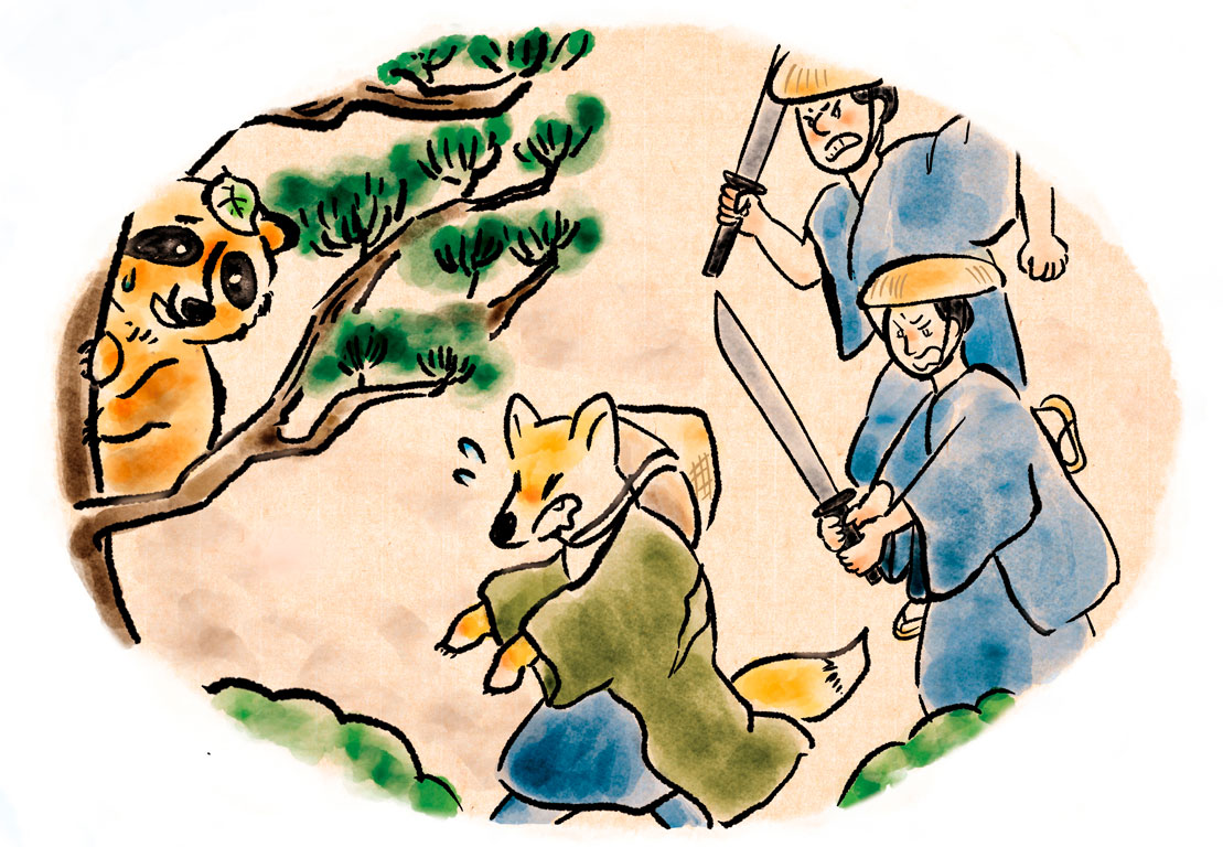 「あっ、狸くん、僕だ僕だ、危ないじゃないか」 と狐があわてたが、 「不届き者!」「たわけ!」と、武士たちがするどい太刀先で構わず狐の旅人に切りこみます。狐は飛び上がり、もんどりうちながら、命からがら薮に飛びこみ逃げ切りました。